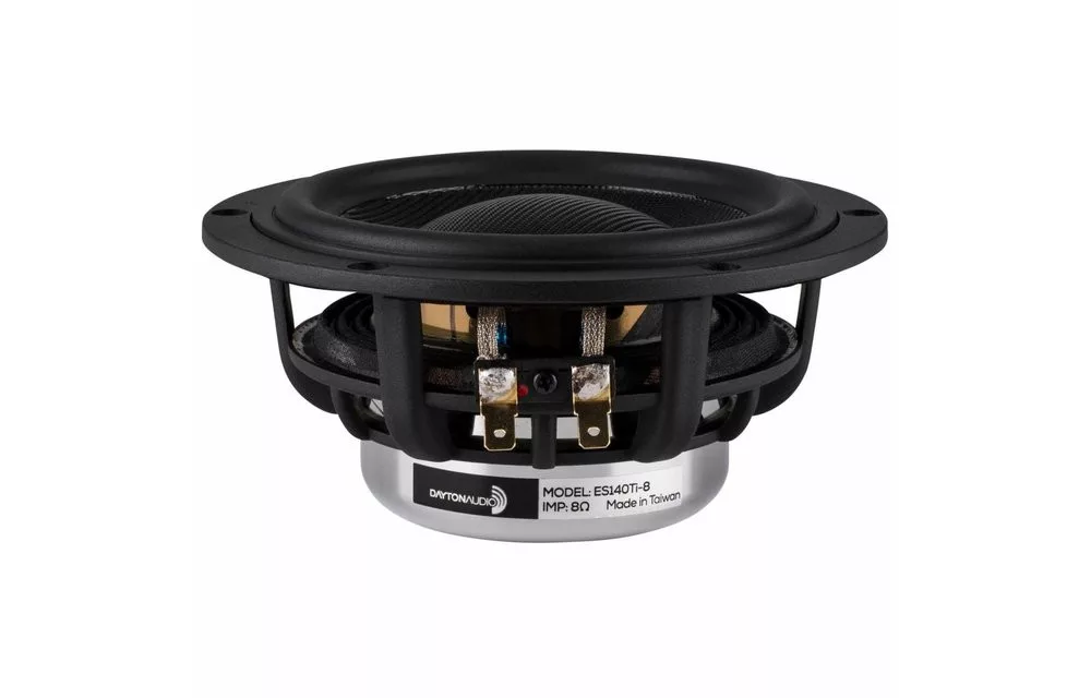 The Dayton Audio ES140Ti-8 is a high-technology 5-1/2" woofer featuring an FEA-optimized neodymium ring motor structure with dual copper shorting rings for ultra-low distortion. Its enormous 3" edge-wound voice coil on a titanium former provides high power handling and excellent transient response. 8 ohm impedance.