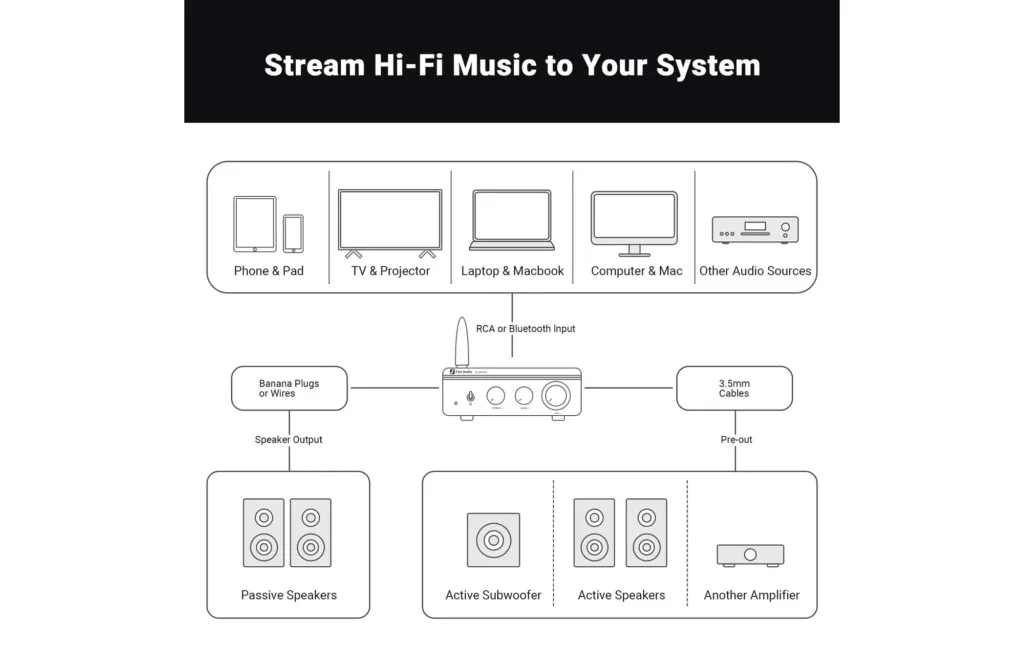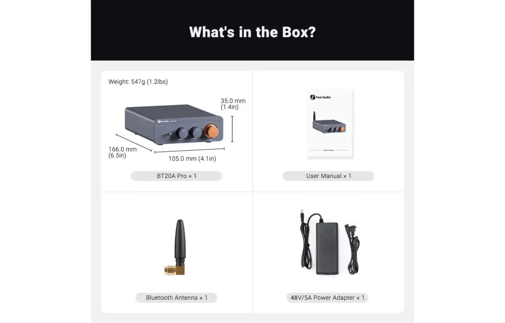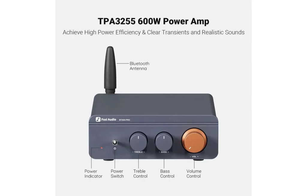 A BT20A PRO erőteljes erősítést kínál a Texas Instruments TPA3255 chipnek köszönhetően, biztosítva a tiszta és részletes hangvisszaadást még nagy hangerő mellett is. A Bluetooth 5.0 csatlakozással vezeték nélkül streamelhet zenét okostelefonról, táblagépről vagy más kompatibilis eszközökről, ezzel megszüntetve a kábelek szükségességét. Emellett az erősítő képes megjegyezni az előzőleg párosított eszközöket, így minden alkalommal zökkenőmentes kapcsolatot biztosít. A mélyközép és magashang-beállítások lehetőséget adnak a hang testreszabására, hogy a saját ízlésének megfelelően alakíthassa a hangzást. Az erősítő kivételes teljesítménye, vezeték nélküli kényelme és hangtestreszabási lehetőségei miatt a Fosi Audio BT20A PRO sztereó erősítő kiváló választás azok számára, akik szeretnék fejleszteni otthoni hallgatási élményüket.