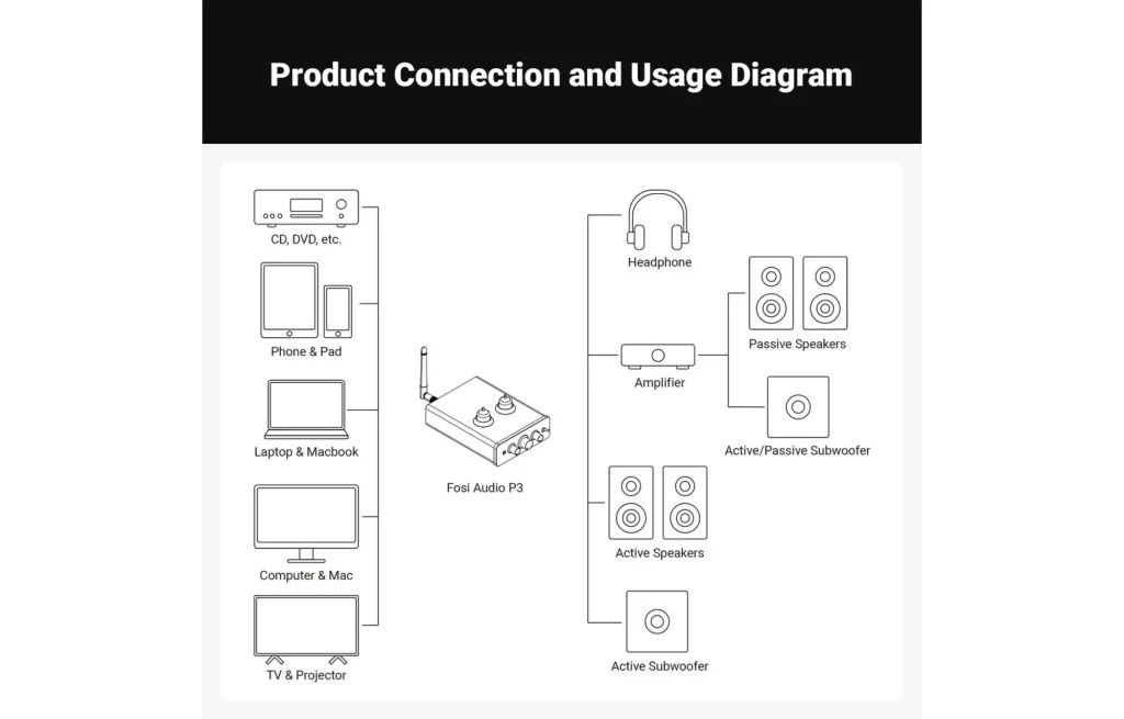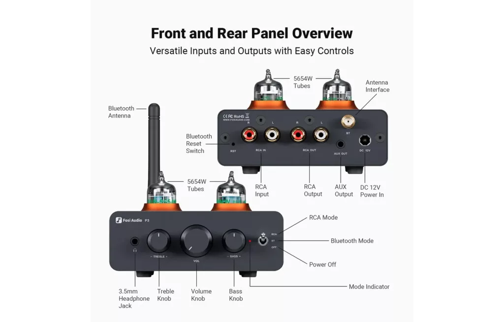 A hangzás mellett a Fosi Audio P3 modern funkciókkal is rendelkezik, amelyek zökkenőmentes integrációt biztosítanak. Bluetooth 5.1 és RCA bemenetek segítségével vezeték nélkül streamelheted a zenét okostelefonról, vagy vezetékes audio forrásokat csatlakoztathatsz, mint például számítógép vagy CD lejátszó. A P3 RCA kimenettel is rendelkezik, amely erősítőhöz vagy aktív hangszórókhoz csatlakoztatható, valamint dedikált fejhallgató kimenettel, hogy még intimebb környezetben élvezhesd a zenét. Sokoldalú csatlakozási lehetőségekkel, kompakt dizájnnal és a csövek varázslatos hangzásával a Fosi Audio P3 Csöves Előerősítő egy vonzó választás azok számára, akik melegséget és karaktert szeretnének adni hallgatási élményükhöz.