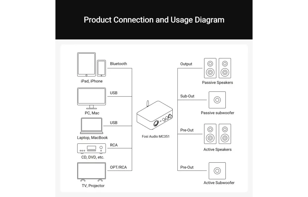 A Fosi Audio MC351 sztereó erősítő egy átfogó és nagy teljesítményű eszköz, amely egy digitális-analóg átalakítót (DAC) és egy integrált erősítőt kombinál. Az audiophile-ok és a házimozi rajongók számára készült, akik erőteljes hangzást és sokoldalú csatlakoztatási lehetőségeket keresnek.