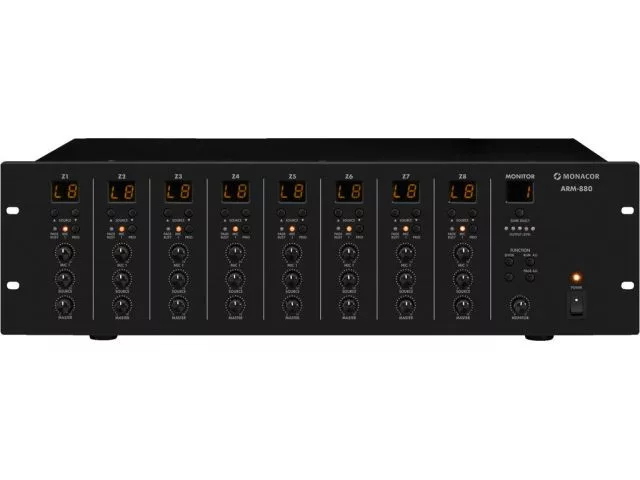 A MONACOR ARM-880 ... rendszere rendkívül rugalmas PA megoldás többzónás alkalmazásokhoz. Ideális szállodákban, éttermekben és bárokban, konferenciatermekben, iskolákban, sportlétesítményekben és fitneszközpontokban. Nyolc különböző audio forrás, például CD lejátszók, SAT vevők, rádióműsorok oszthatók el a 8 kimeneti zónába, bármilyen hozzárendeléssel.