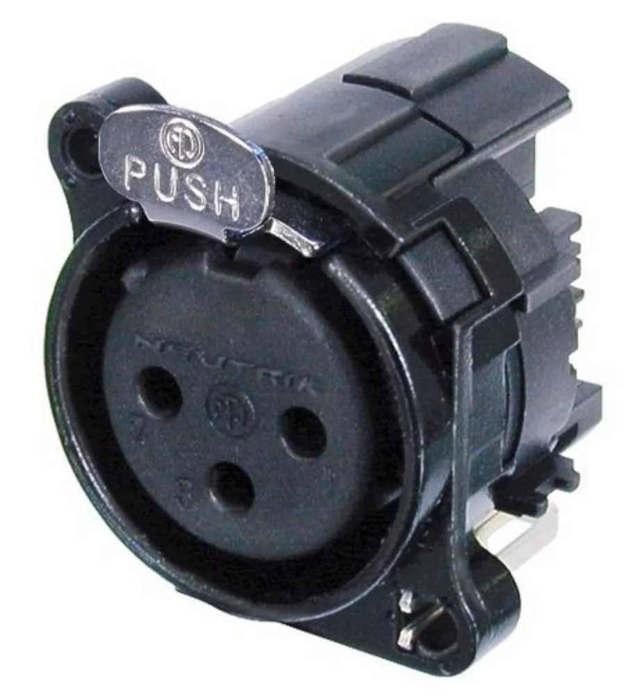 Neutrik NC3FBH1B 3 pólusú XLR aljzat fekete, vízszintes nyákhoz, közösített 1. láb+GND+ház, retesszel