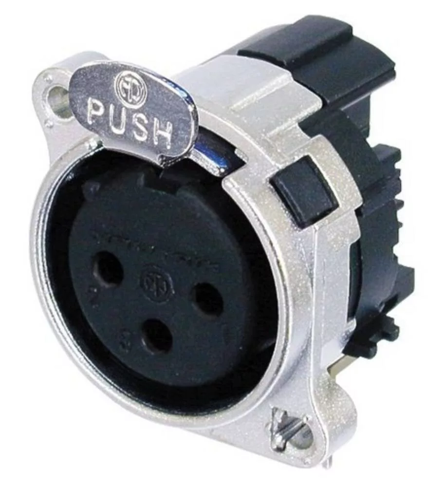 Neutrik NC3FBH2 3 pólusú XLR aljzat vízszintes nyákhoz, külön GND és ház, retesszel